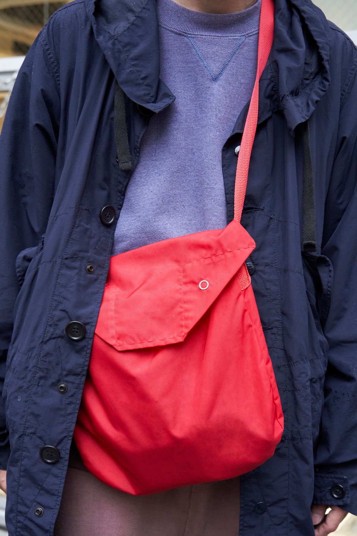 赤いバッグはあえてコートの内側に挿し、ウェアのレイヤード感覚で身につける。こなれ見え確定のお手軽テクニック、覚えておこう。