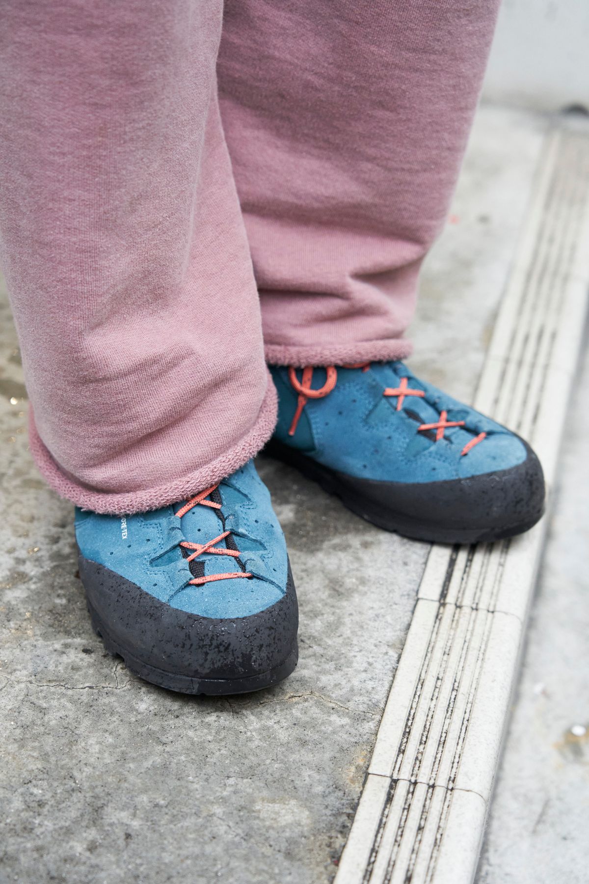 キャップからシューズまで、ひとつとして同じ色がない多色コーディネイトの達人。濃淡の使い方も巧みで、淡いトーンのスウェットとパキっとしたネイビーのコートが心地いいメリハリを生む。