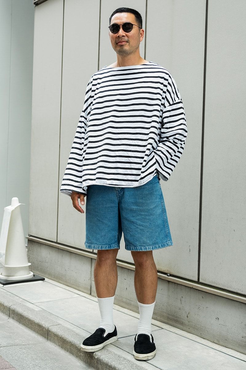 雄一朗さんが選んだカットソーは2021年にスタートしたシテンの一枚。ゆとりのあるシルエットとボートネックが涼しげで、夫婦で揃えたデニムショーツも見事にサマになっている。微笑ましい!