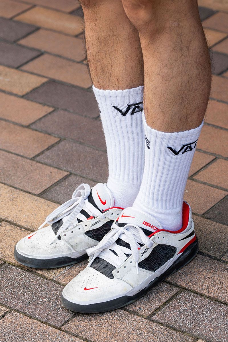 ソックスはヴァンズ、そしてスニーカーはもちろんナイキのスケボーライン「SB」の一足をチョイス。白黒のモノトーンコーデに、微かに浮かんだ“赤”。この絶妙な匙加減……素敵だ。