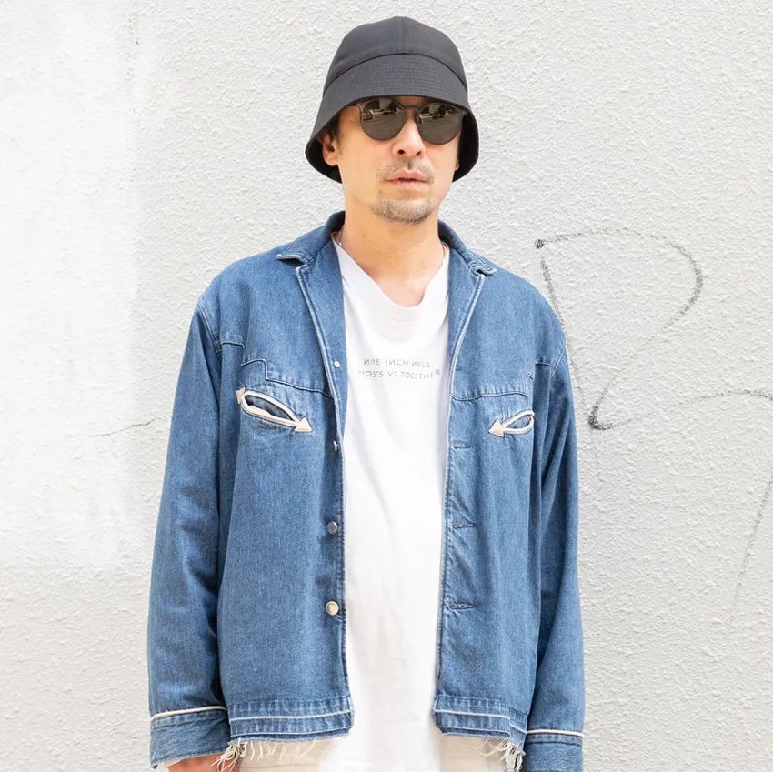 ▶︎丸山さんのスナップをすべて見る丸山健志さん(45歳)ウエスタンテイストのデニム・オン・デニムでまとめたスタイリング。爽やかなライトブルーを基調に、黒の小物で全体を引き締めた。