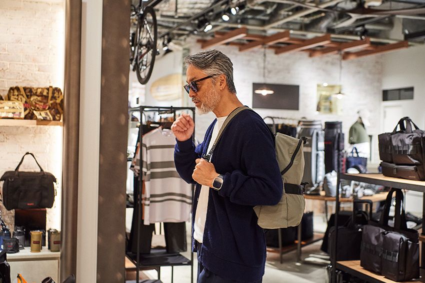 旅好きのタネさんは、「ブリーフィング」にてスーツケースもチェック。「ビームスにいた頃からよく知っているブランドで、不変のタフネスは折り紙付きですよね」と信頼を置く。