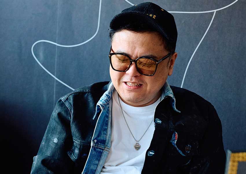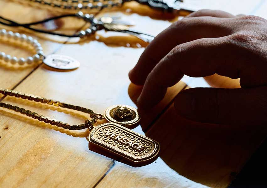 「今⽇はネックレス1本だけですが、2〜3本を重ねづけすることもぜんぜんあります。ネックレスをたくさん着けているときは、僕の中で⾎湧き⾁躍っている状態と⾔いますか、気が⽴っているときですね」。