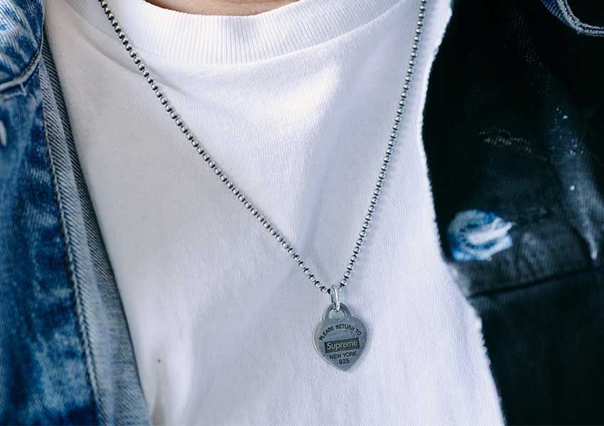 この⽇着けていたハート型のネックレスは、⼤好きなシュプリームのものだ。しかもティファニーとのコラボというスペシャルなもの。