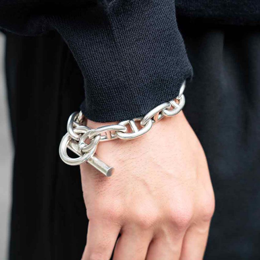 ほかにも、ジルサンダーのネックレスやエルメスのブレスレットなど、脇を固める小物の使い方にこだわりが。足元のサンバも同じロジック。愛を感じる。