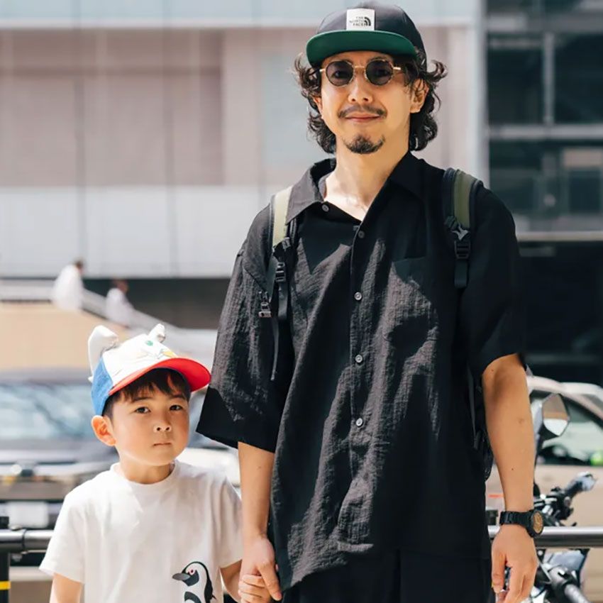▶︎川向さんのスナップをすべて見る川向仁志さん(45歳)オールブラックのセットアップ風がなんともイタについたオトーチャン。その空気感の源泉は、ゆとりのあるシルエットが匂わす余裕にあるのかもしれない。なにせ着用しているシャツは、程よく肩が落ち、身幅もとられたリラックス感たっぷりのモダンな1着である。