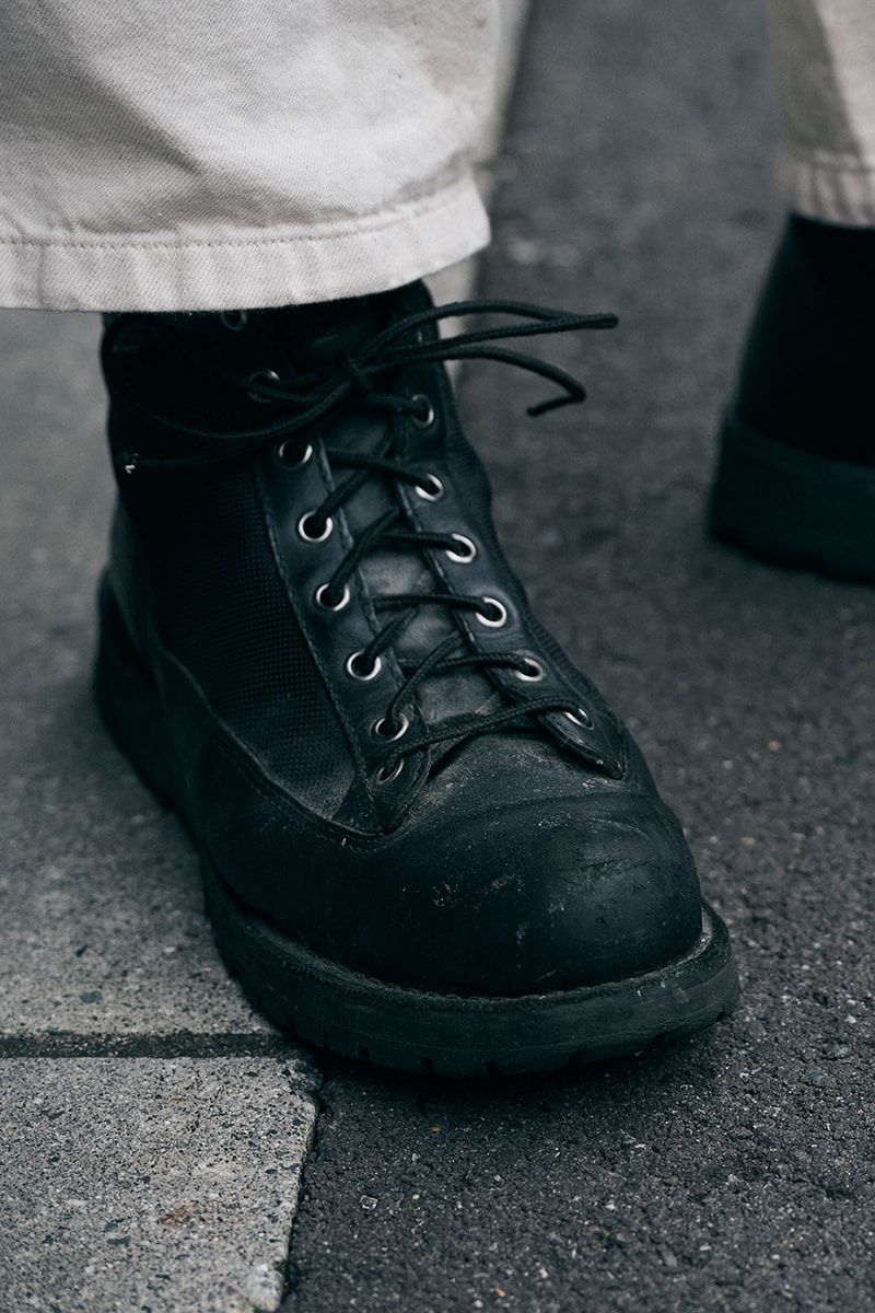 ワークなテイストが香る上下にダナーのブーツでダメ押し。キャップからも同じくワークなムードが香るが、インナーに挿したオレンジの花柄シャツが武骨な雰囲気を程よく中和。若くして使い分ける足し算&引き算のテクに驚嘆。