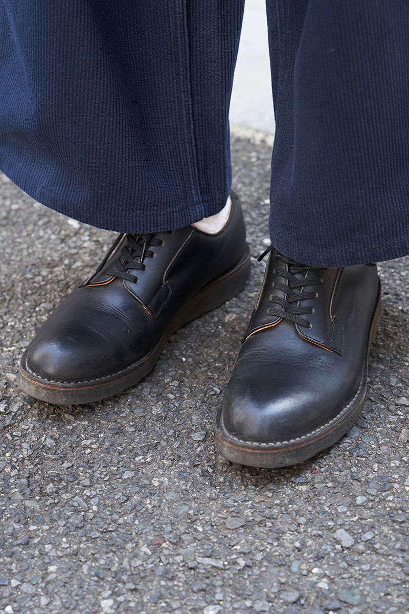 ▶︎ゆうさんのスナップをすべて見るゆうさん(30歳)ネイビーのコーデュロイパンツにダナーの革靴を合わせて、骨太な下半身を構築。一方で上半身は、エスニックなシャツで陽気に。個性的な織り柄の存在感は、文句なしに主役級だ。