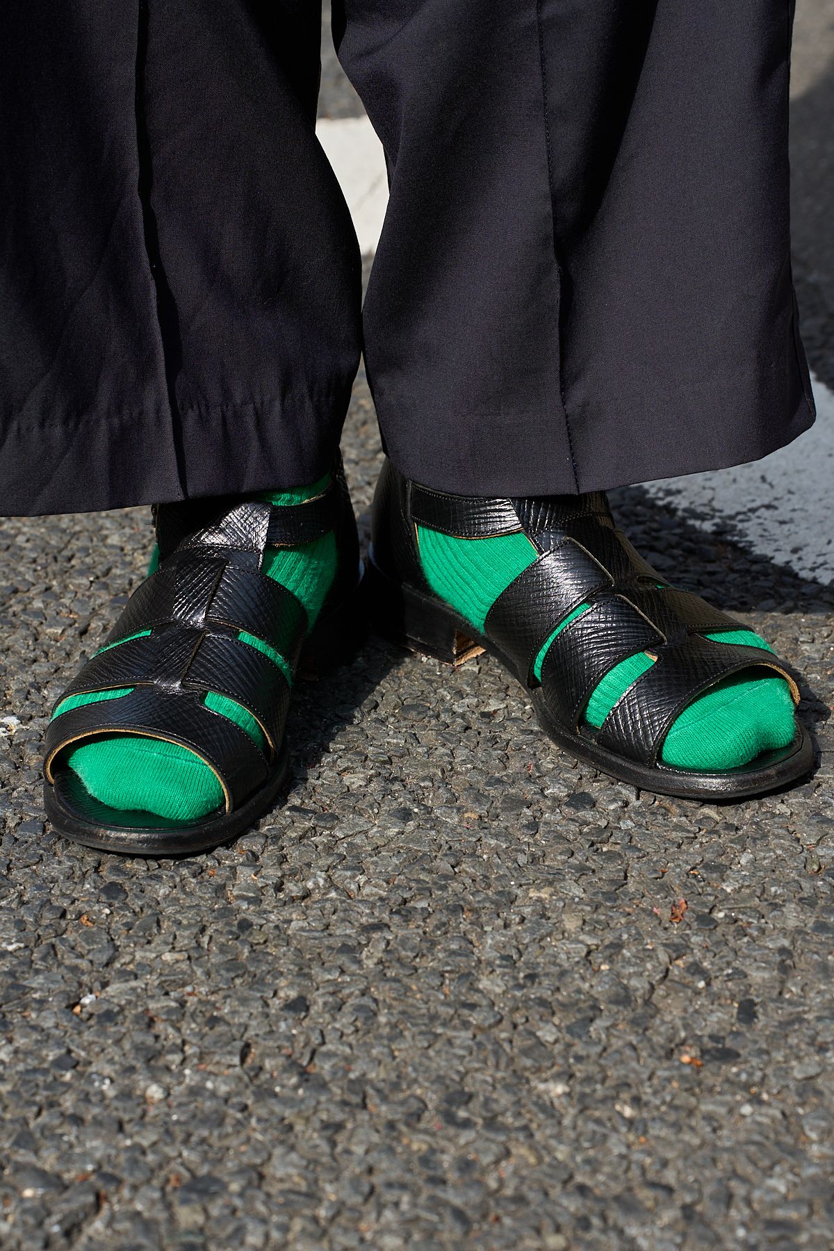 シャツの原色に寄り添わせるかのように、グリーンのソックスをチョイス。開放感のあるサンダルから少しだけ覗くというギミックも洒落ている。
