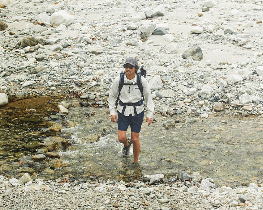 速乾性のあるショーツの上に、伸縮性のあるシャツをサラッと羽織る。そんな大石流トレッキングスタイルにも「ピークフリーク ラッシュ シャンダル」は、相性が良い。