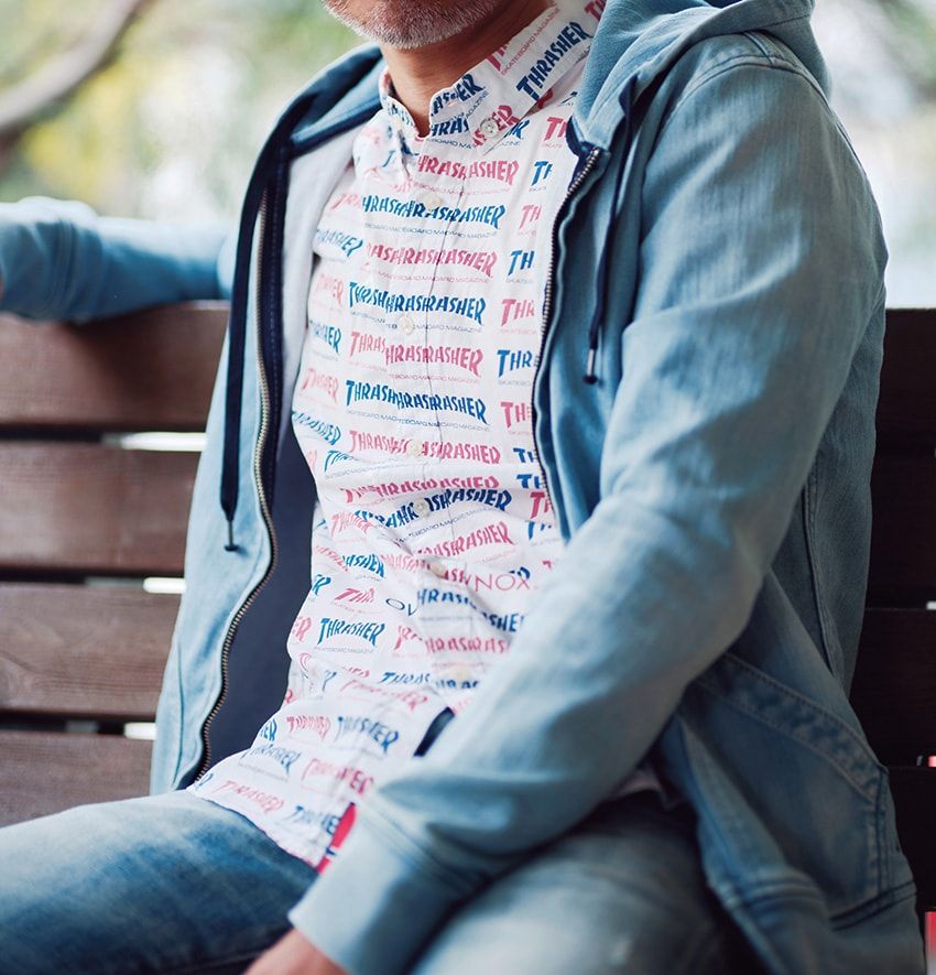 淡いブルーのパーカが海辺の暮らしに自然と馴染む。赤と青のロゴシャツと星条旗柄のスニーカーをアクセントに利かせ、その色合いは岩切さんの好きなカリフォルニアのムードを演出する。