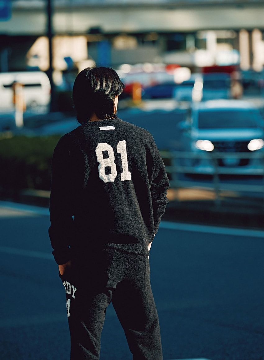 ニット地のセットアップは海へ向かうときの定番。優しい肌触りが持ち味のリラックスウェアだが、タイトなシルエットとシックな色使いゆえ、街着としてもヘビロテしているそう。