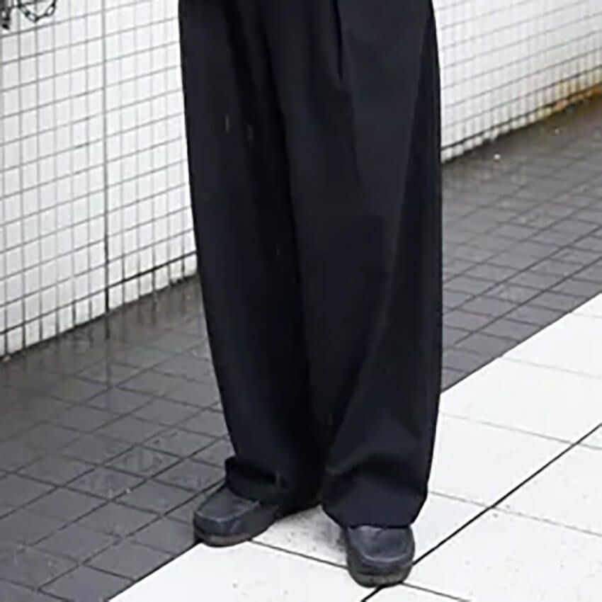 ▶︎たいちさんのスナップをすべて見るたいちさん(26歳)大胆な花柄にまず目が行くのは間違いない。でも、パンツの存在感だって負けちゃいない。形のいいワイドテーパードが品とセンスを伝える、ユニクロのブラックスラックスである。