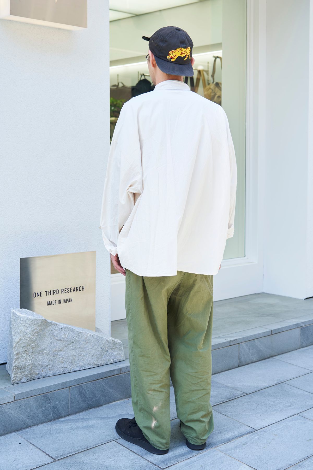 カーキカラーのワイドシルエット。しかも古着。それでも野暮ったく見えないのは、やはり白シャツとの合わせによるところが大きい。しっかりボタンを留めたのも奏功している。