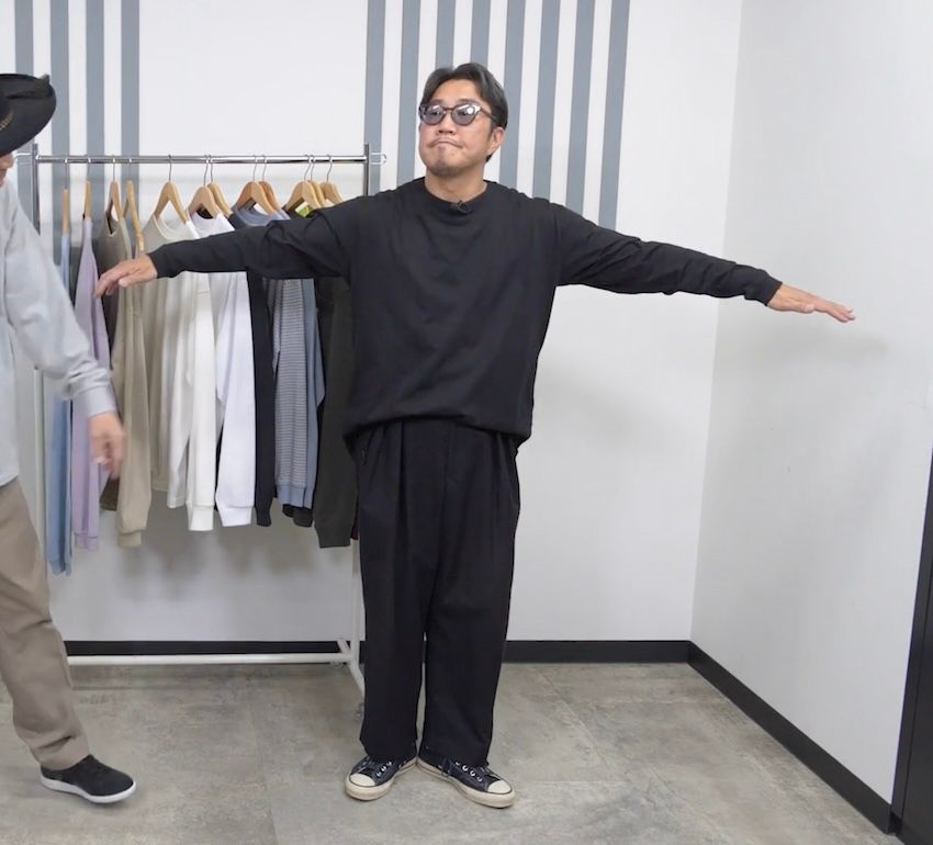 ハラ(178cm、60kg)は「フルーツオブザルーム」のLサイズ、キクチさん(171cm、70kg)はXLサイズを着用
