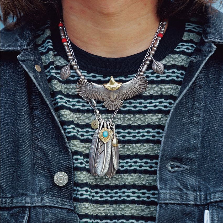Gジャンはオーバーサイズでゆるく羽織り、首元には存在感抜群のゴローズをチョイス。職業はデザイナーという稲田さんの感性が光る。