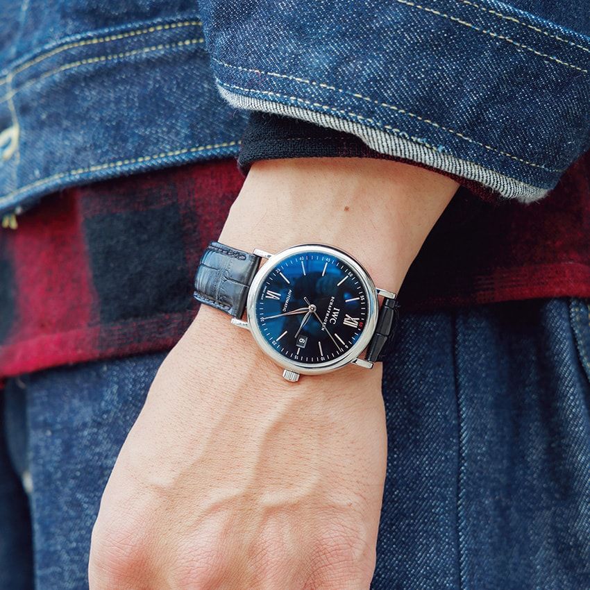 Gジャンから覗くバッファローチェック、ロールアップしたパンツの裾、海とリンクするIWC「ポートフィノ」など、細部へのこだわりも感じられる。