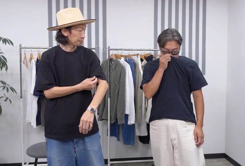 ハラ(178cm、60kg)は「プロクラブ」、キクチさん(171cm、70kg)は「ギルダン」のLサイズを着用