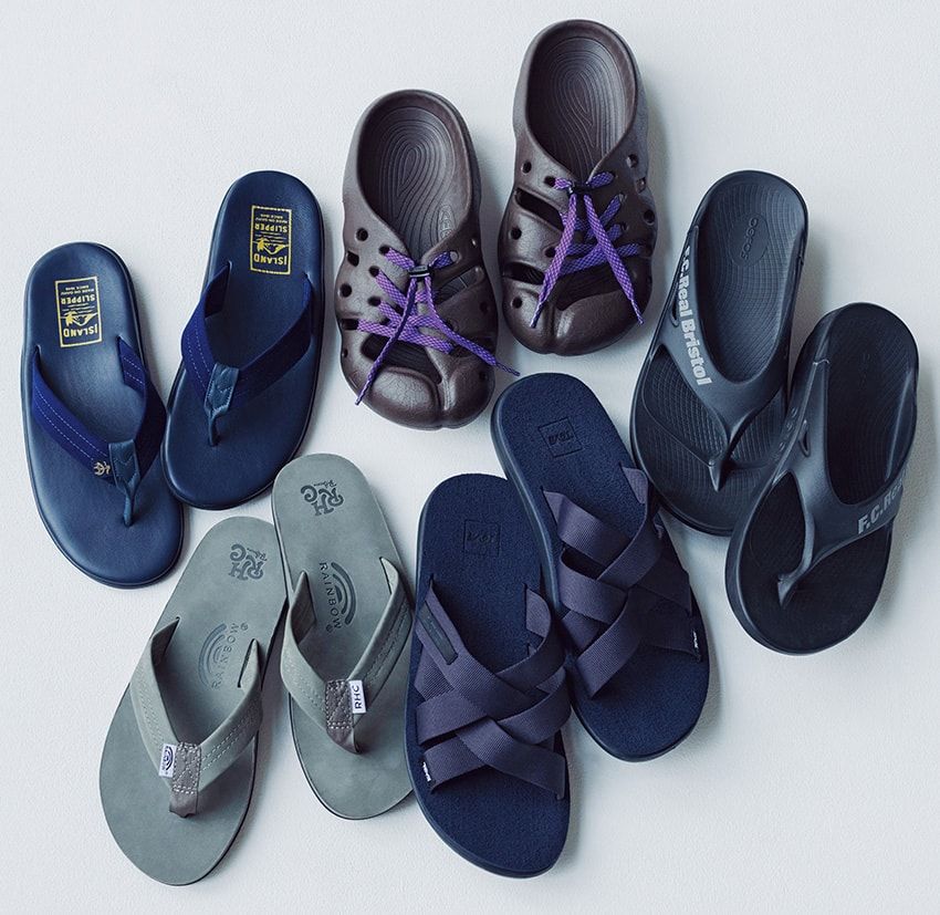 サンダル3万800円/ブルックス ブラザーズ × アイランドスリッパ(ブルックス ブラザーズ ジャパン 0120-02-1818)、ジャケット8万8000円、スラックス4万7300円/ともにマーカウエア(パーキング 03-6412-8217)、Tシャツ2万6400円/タトラス(タトラス 銀座店 03-6228-7770)、ベルト2万4200円/ラぺルク info@editandcoltd.co.jp