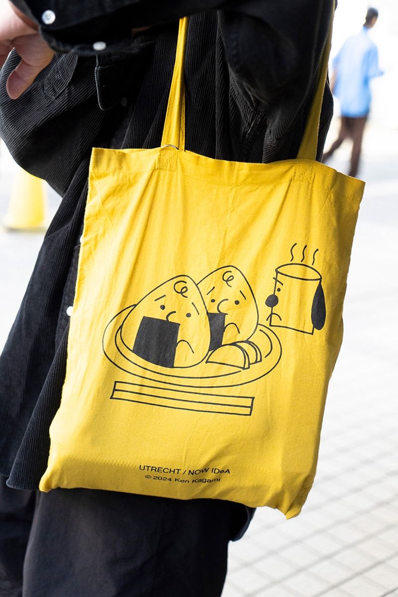 足元もナイキの黒スニーカーで締めつつ、トートバッグだけパキッとしたイエローをチョイス。加賀美 健氏のイラストがキャッチーで愛くるしい。