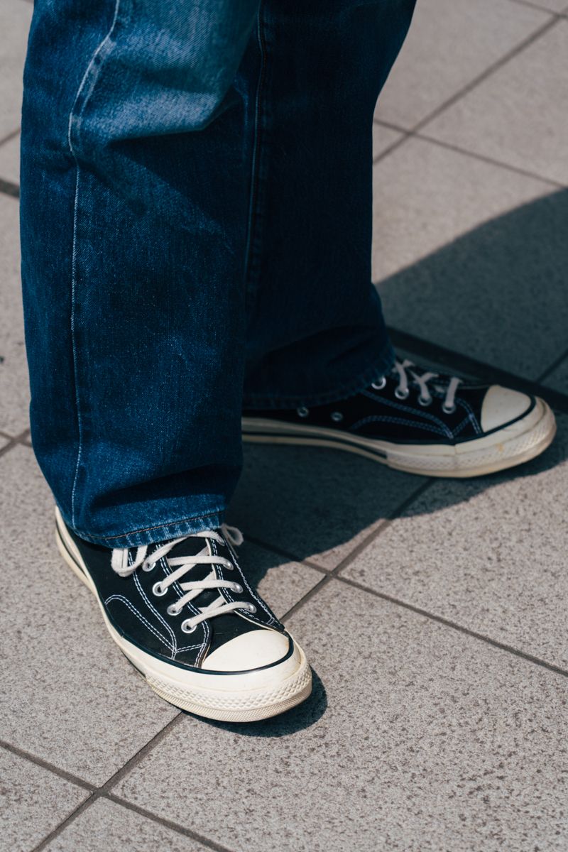 “V字”の最尖端部を担ったのが「チャックテイラー」だ。小ぶりなトゥーキャップがシャープな印象を与え、特有のサイドステッチが小粋な印象を加速させる。大ぶりなハットも含め、全てのバランス感に優れたグッドコーデだ。