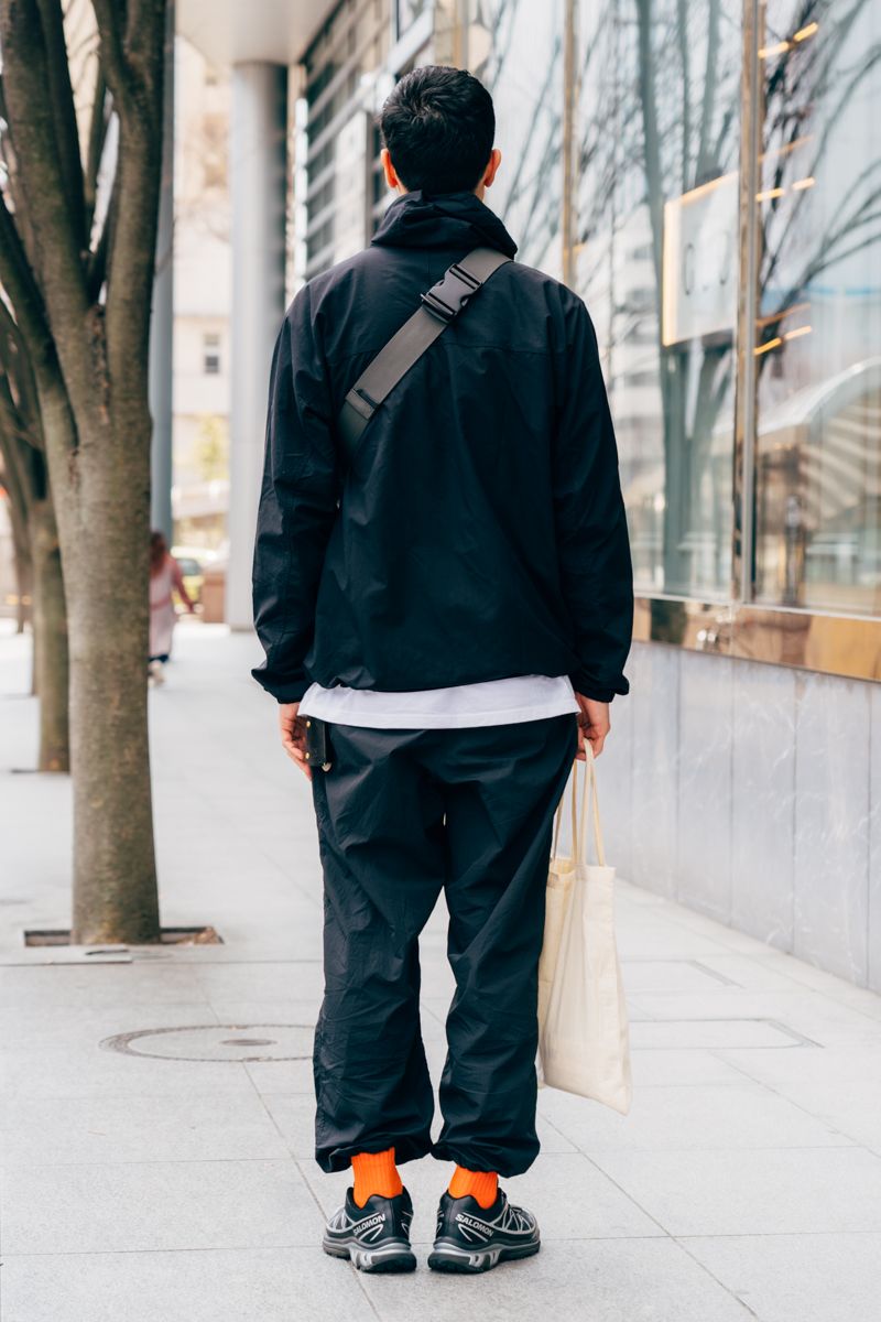 モンベルの防風ジャケットと防風パンツという上下黒のテックスタイルでまとめた工藤さんは、白Tをアクセントにしてカジュアル感をプラス。アウターから少しはみ出すくらいのサイジングも絶妙だ。