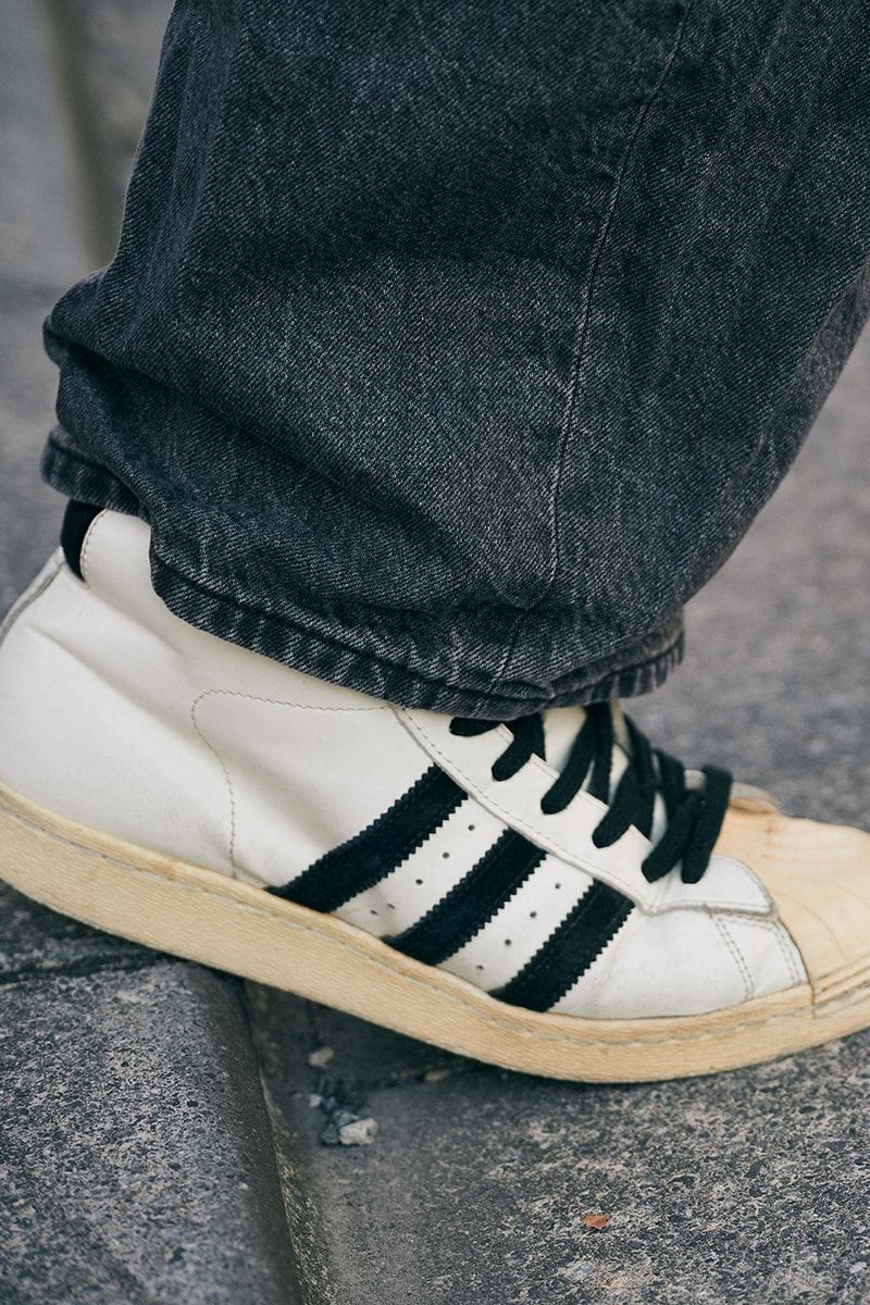 ジャケット=アディダス Tシャツ=ブラックピッツァスタジオ デニム=ジーユー スニーカー=アディダス オリジナルス 帽子=ヴェロスピカ