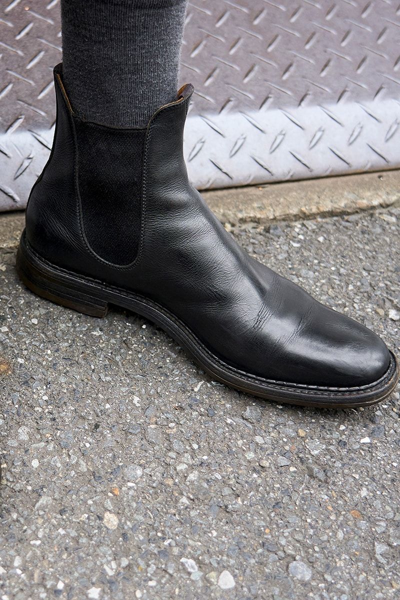 ▶︎深谷さんのスナップをすべて見る深谷壮麻さん(40歳)ジャストなサイジング、立体的な格子柄を備えたカットソーが、黒本来のモードな匂いを助長。タックインしてベルトとソックスまで黒で揃えた、オール隙なしの上級者モードだ。