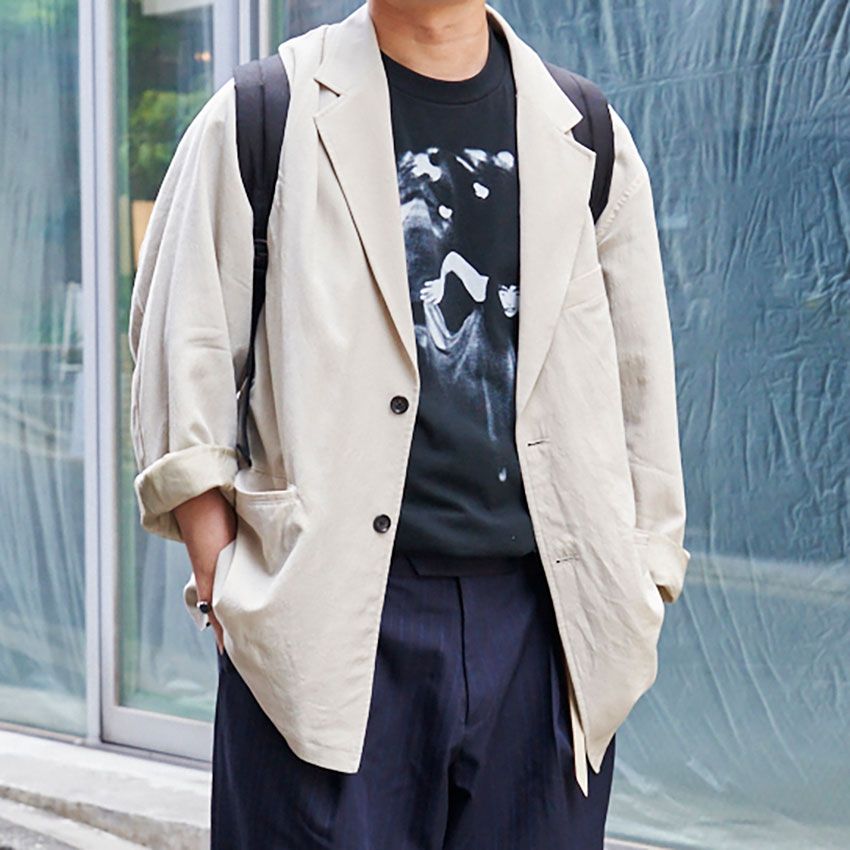 ▶︎難波さんのスナップをすべて見る難波俊平さん(27歳)ネイビージャケットにインディゴデニム、インナーのグラフィックTに足元のオールスター。すべてをブルー&ネイビーで揃えた、清潔感溢れる“グラデ系”スタイルを構築した。