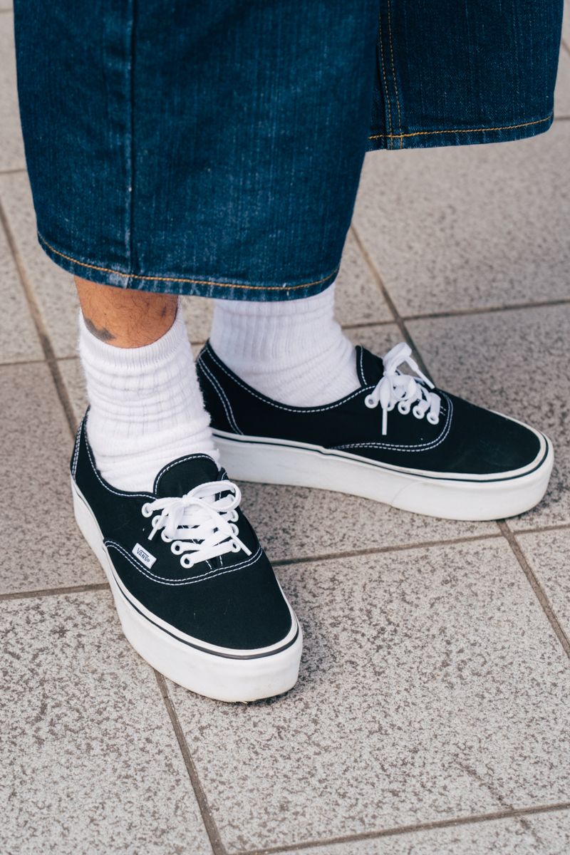 合わせたのは「オールドスクール」。厚めのソールからして“プラットフォーム”だろう。一方、パンツは太すぎないシルエットに抑え、ニットやシャツで上品さをプラス。各アイテムの選びが、大人のショーツ姿の正当性を担保する。
