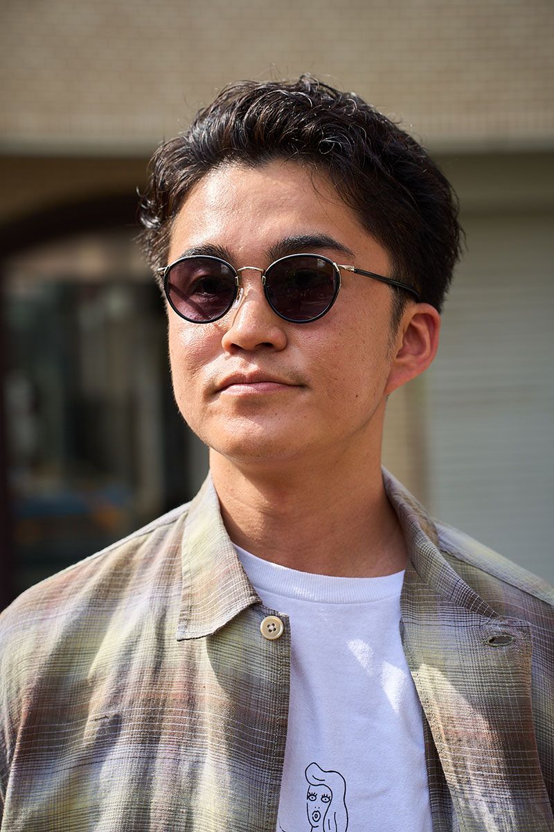 シャツ=アワーレガシー Tシャツ=カスバ×ワコマリア パンツ=ヤエカ シューズ=ヴァンズ 眼鏡=不明