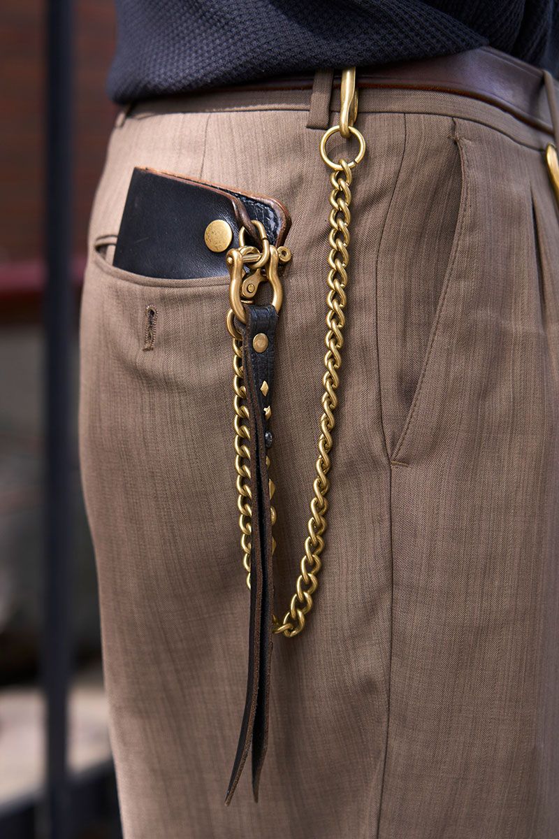 ベルト&キーリングはシルバー&ゴールドの2色使いでラギッドに。チェーンの行き着く先のレザーウォレットと、革ベルトのリンクもお見事なり。