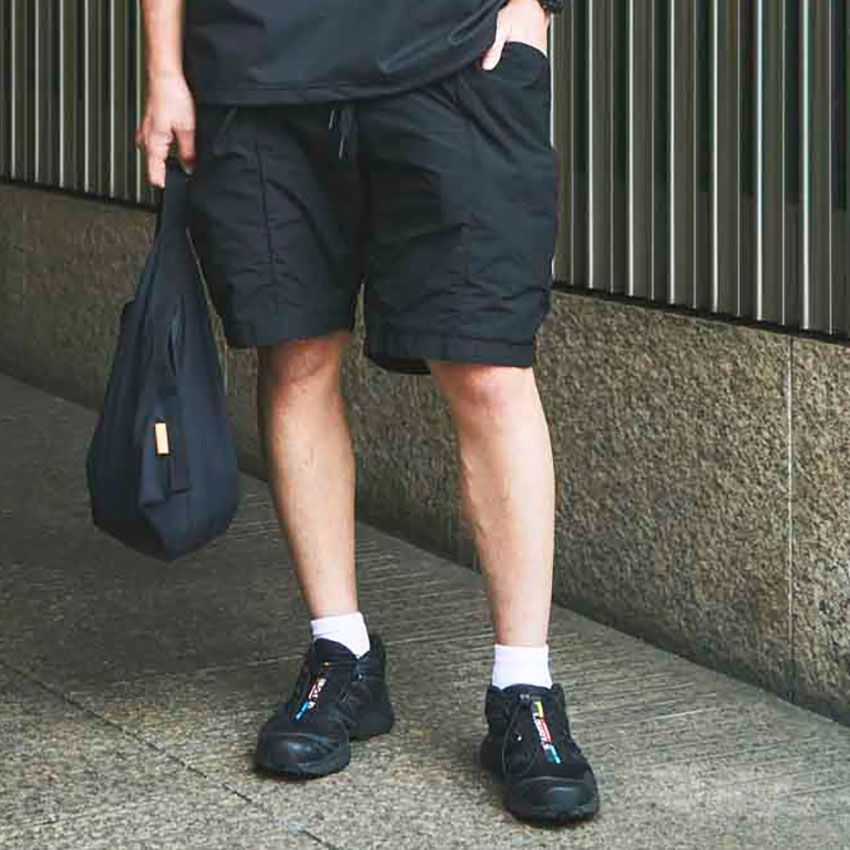 ナイロン系のショーツを筆頭に、異なる素材感を組み合わせるのも黒の玄人が頼る常套手段。とりあえず試してみて。