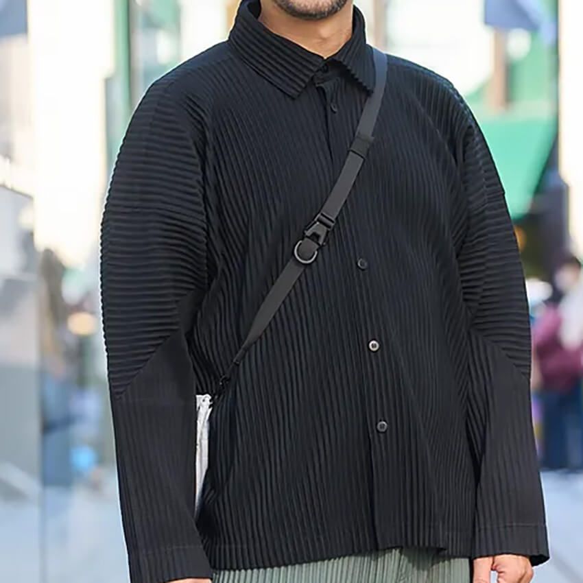 ▶︎ジャスパーさんのスナップをすべて見るジャスパーさん(41歳)全体に落とし込まれた優雅なプリーツはお察しのとおり、プリーツプリーズ イッセイミヤケ。キーとなるのは上下のコントラストで、シャツとは異なるマイルドなペールトーンの一本が、黒の引き締まった印象をより強めている。ゆえに、シルエットがオーバーだろうと重たくは感じられないのだ。