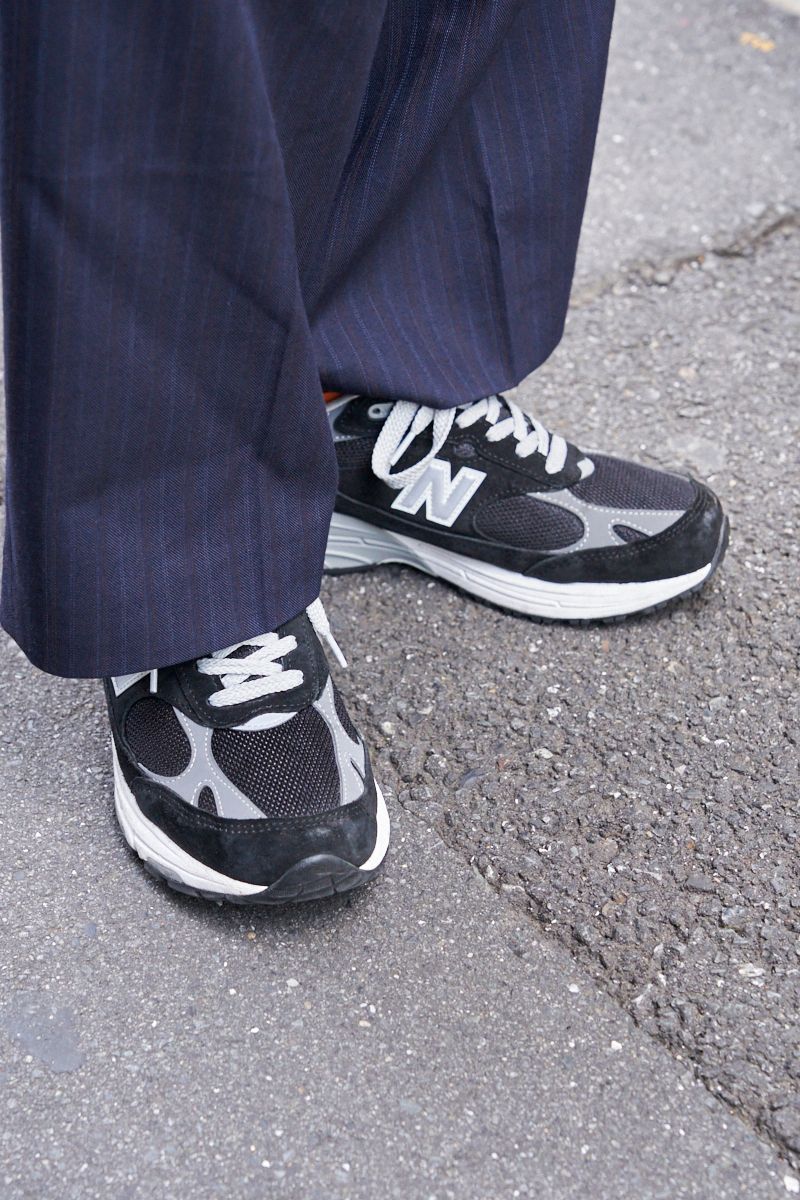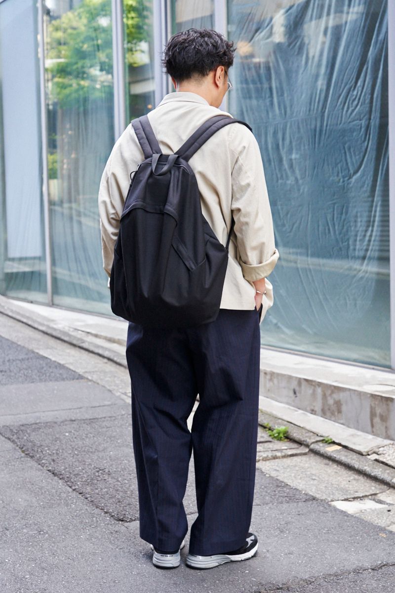 アンコン仕立てのたっぷりめなシルエットで、袖を捲れるほどの軽やかな生地の一着。ボトムスも大胆なワイドシルエットゆえ、スラックスの堅苦しさは皆無。そのため、Tシャツをインナーに取り入れようと、リュックやスニーカーを合わせようと浮いている様子は見られない。かしこまらないテーラードジャケット、使える。