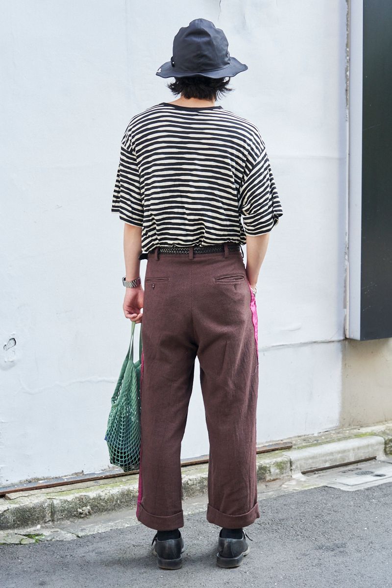 ▶︎ゆうきさんのスナップをすべて見るゆうきさん(25歳)こちらは半袖のボーダーTを着用。いい大人であればそこに経験という名の渋さやコクを出したいが、インバーテッドプリーツのクラシカルな茶スラックスを採用すれば、その狙いはあらかた達成したようなものである。