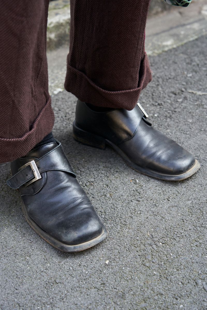 ゆうきさんが巧妙なのは、タックインすることでどちらにも転び過ぎることなくバランスを保ったところにある。そこへ、ロングブリムが印象的なハットやシングルモンクの革靴、編み込みのベルトと、各所に黒を仕込むことでより落ち着いた雰囲気を作った手はずもお見事。