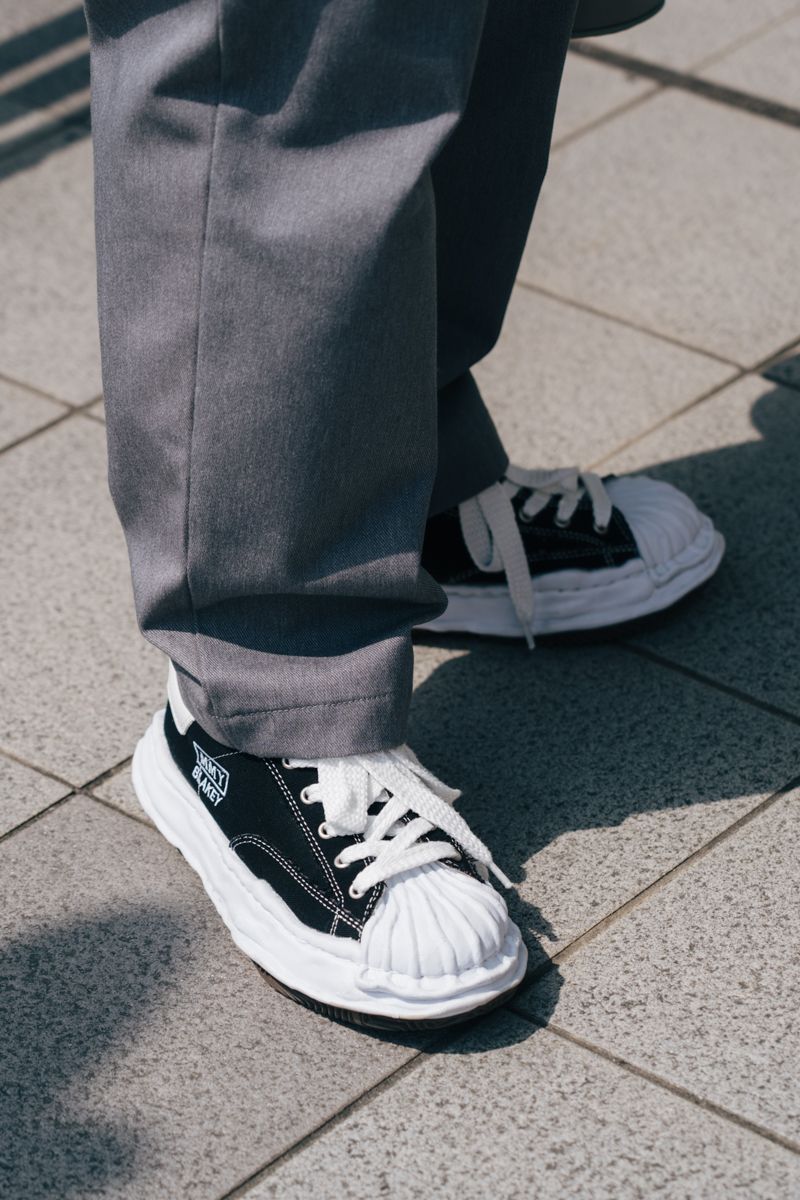 シンプルな着こなしゆえに、藍原さんは個性的なアイテムを散りばめ、自分をさりげなく主張する。手に持つのは、ナイロン素材の巾着袋。足元は、大胆なビッグフォルムが存在感絶大のスニーカーである。ファッションを楽しむ余裕も忘れない。大人がいつも心がけたいスタイルをしっかり体現している。