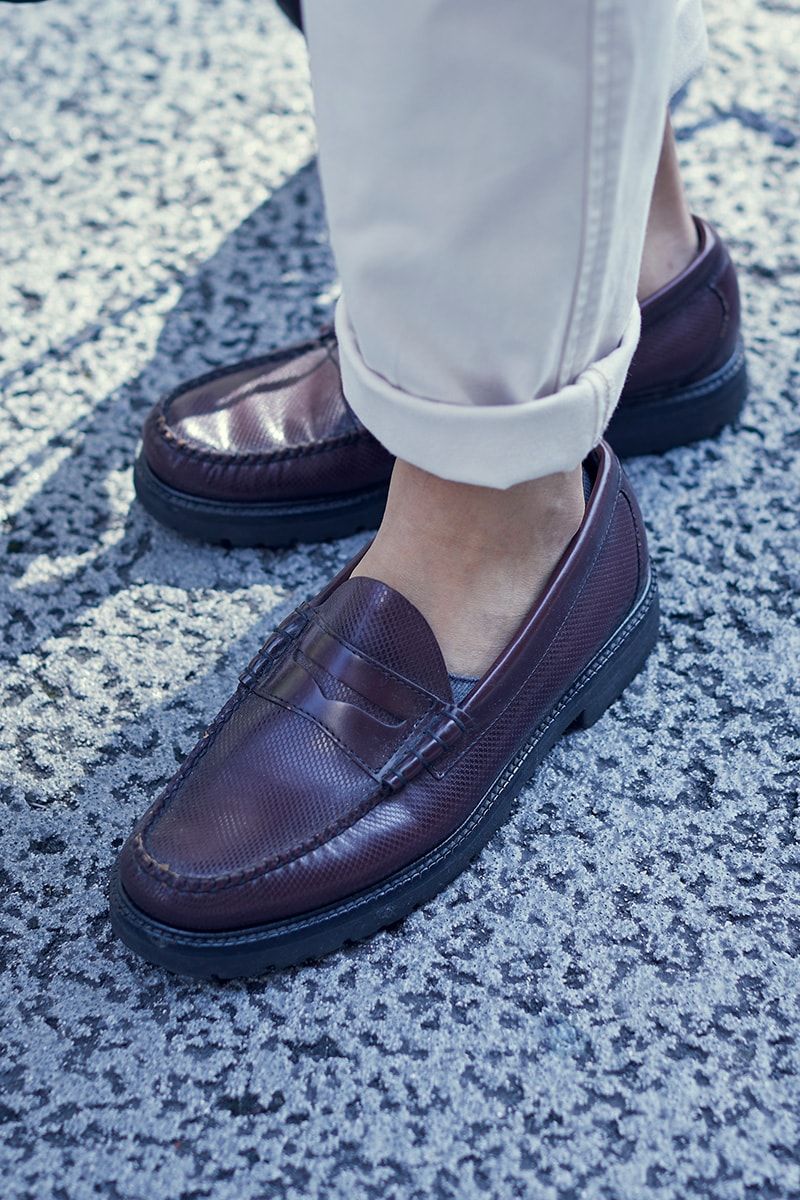 白の上下にブルーのデニムシャツでまとめたキレイめカジュアルは、小ぶりで品のいい白のミニベロとベストマッチ。クレバーな佇まいをジーエイチバスのローファーがダメ押しする。