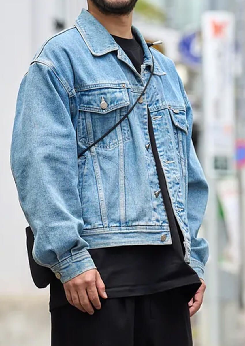 【写真8点】「爽やかさ満点!ライトブルーの「Gジャン」を洒落るコツはレイヤード、個性派パンツetc.」の詳細を写真でチェック ① デニムレイヤードにモードなパンツを添えて