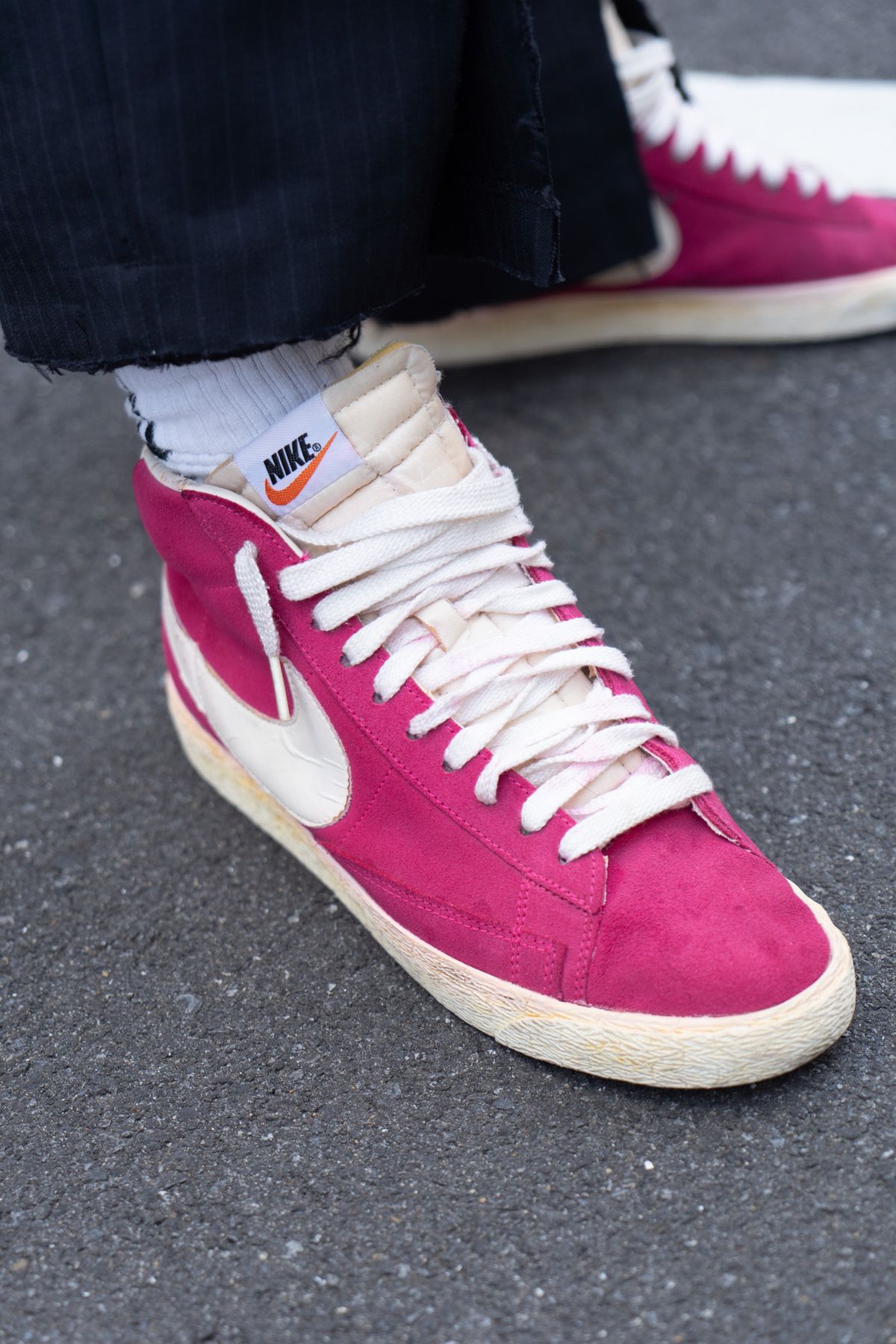 センタープレスの効いたスラックスは、裾にスリットが入った個性的なシルエットだ。それにより、ピンク色のナイキ ブレーザーが挿し色としての効力を発揮する。