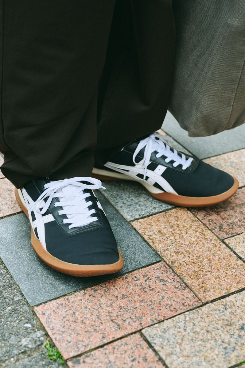 ボトムスはシンプルにスラックス、スニーカーはオニツカタイガー。いずれもカラーはブラックを選択し、コーデを程よく引き締めた。色使いでメリハリの効かせた、春夏らしい装いだ。