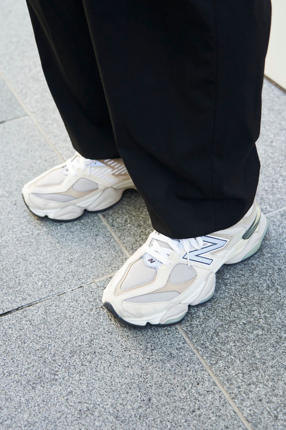 足元は爽やかなニューバランスの白。ただし、「90/60」でクリーンに纏めすぎないのがポイントだ。程よいダッドさがハズしとなってコーデのお洒落感を格上げする。