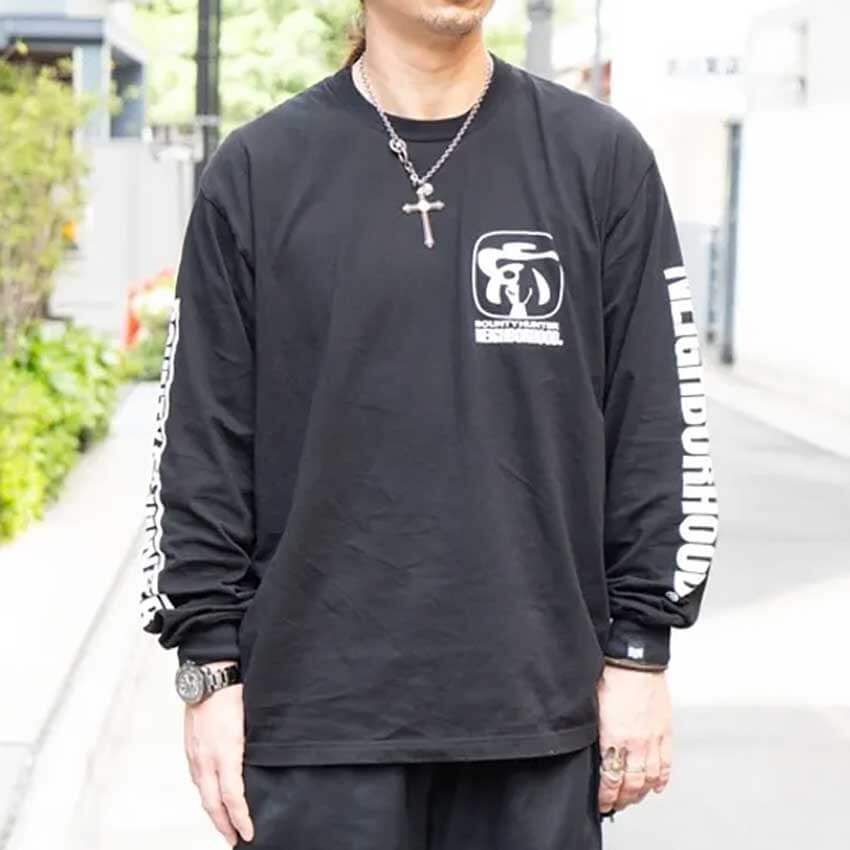 ▶山崎さんのスナップをすべて見る山崎大輔さん(43歳)まずは、ストリートなロンTの醍醐味である“袖デザイン”で主張したスタイルを。バウンティハンターとネイバーフッド。日本が誇る両雄の名が、両袖にしかと記される。