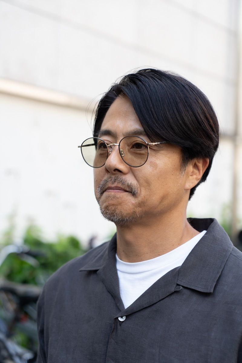 シャツ=マーカウェア Tシャツ=グラフペーパー デニム=スタジオニコルソン シューズ=ナイキ 眼鏡=ブランク