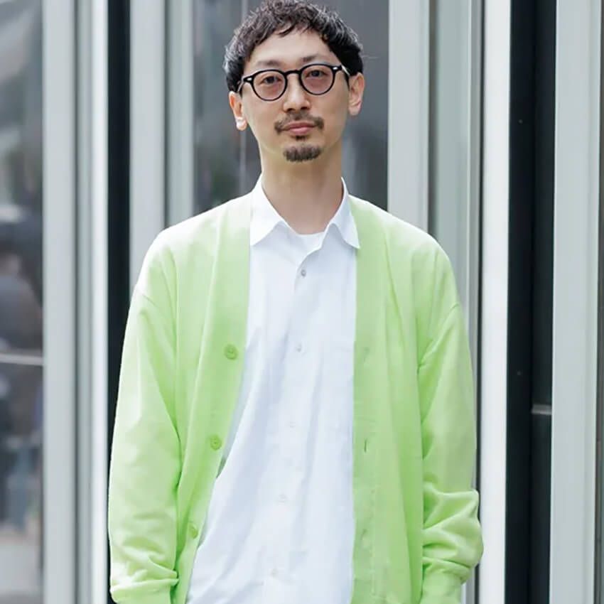 カーディガン=エディフィス シャツ=ユナイテッドアローズ デニム=コモリ シューズ=アシックス 眼鏡=金子眼鏡 腕時計=グランドセイコー