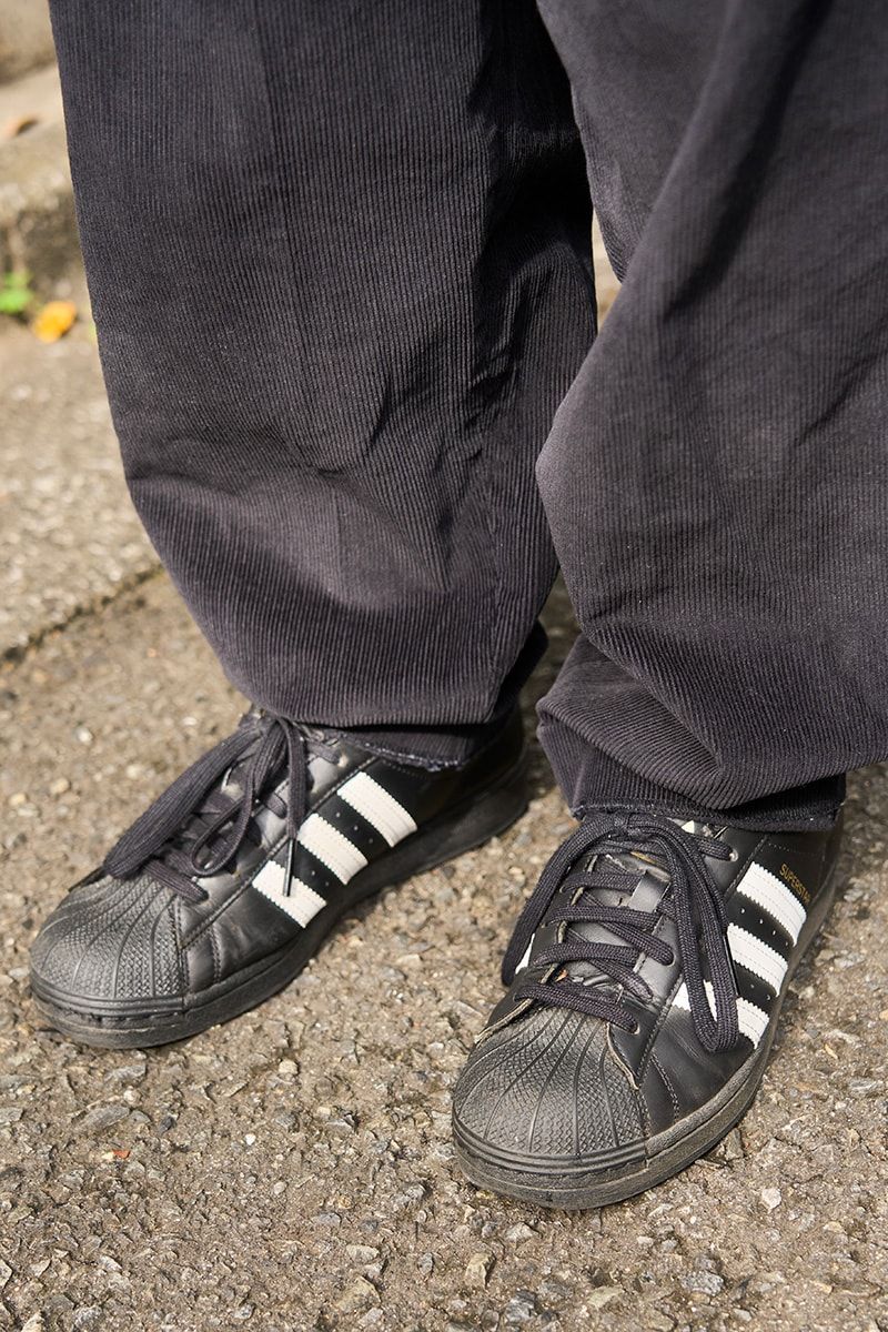 カーディガン=コムデギャルソン Tシャツ=ユニバーサルオーバーオール パンツ=ヨシオクボ スニーカー=アディダス オリジナルス
