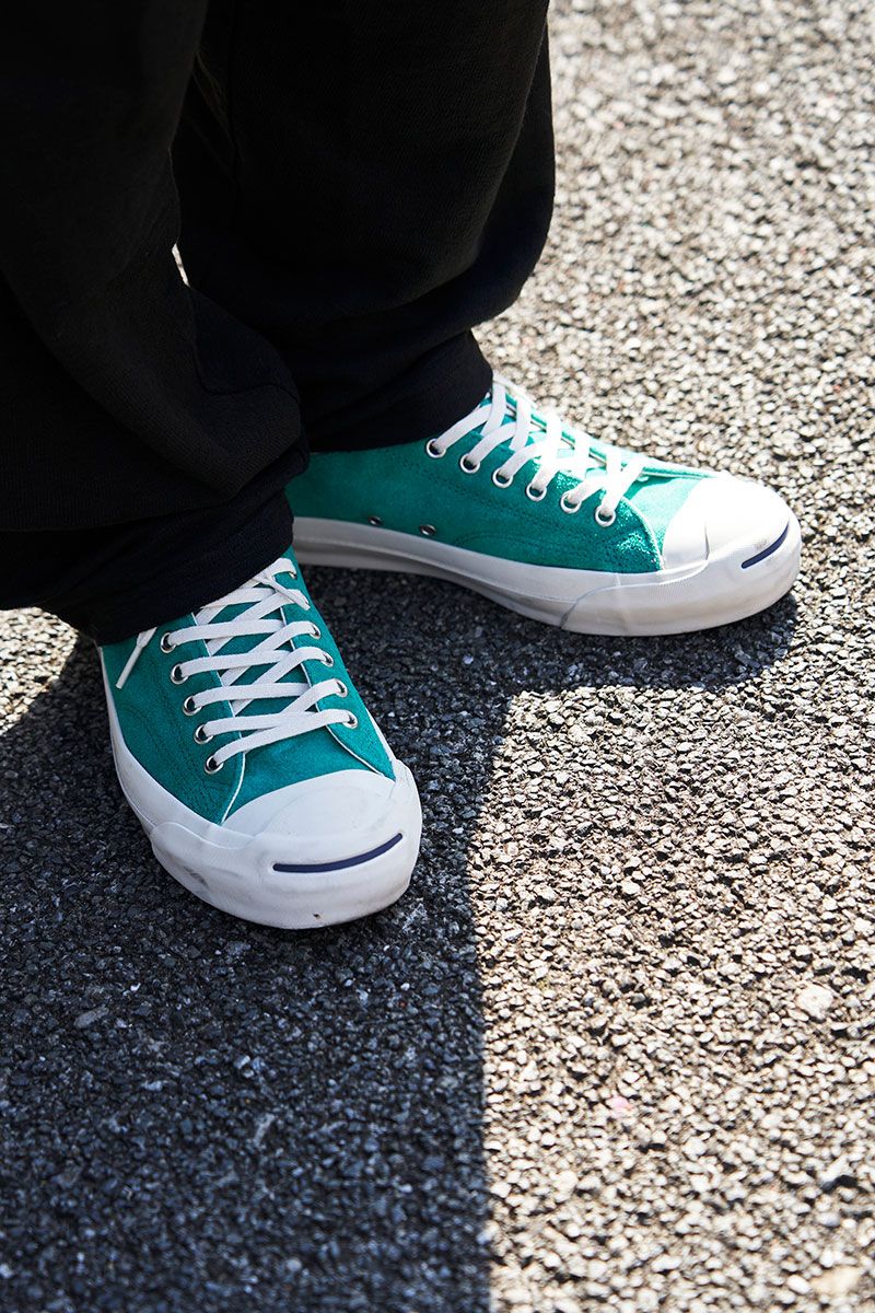 そんなソリッドなスタイルに挿し色として使ったのがジャックパーセル。深みのあるエメラルドグリーンが、コーディネイトを足元から明るく照らす。