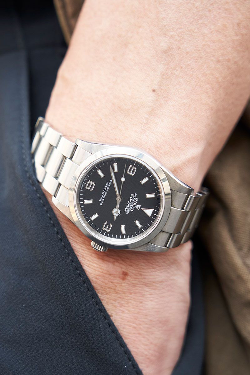 で、腕元にはロレックスの名機を。装い全身から読み取れる品の良さに、小振りサイズのシンプルデザインがベストマッチ。個性的な、メガネとサングラスの二刀流もお見逃しなく。