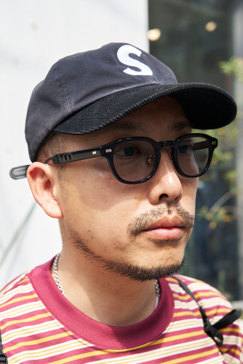 Tシャツ、バッグ=ともにダイワピア39 パンツ=カップアンドコーン シューズ=ニューバランス 帽子=シュプリーム 眼鏡=モスコット ネックレス=ビルウォールレザー